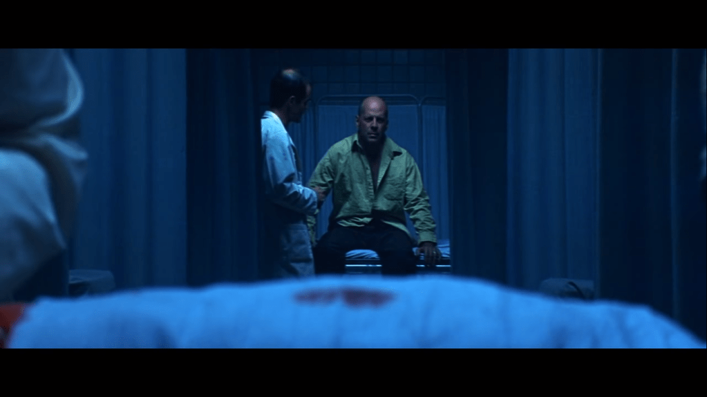 Shyamalan réinvente intelligemment ce concept au début de Incassable lors d’un plan fixe très touchant. En pleine phase de réveil après l’accident ferroviaire dont il est le seul survivant, David Dunn est relégué au fond du cadre tandis que s’affairent à l’avant-plan, sous le nez du public, une poignée de chirurgiens tentant de sauver l’une des victimes. Une tache de sang signifiante viendra annoncer le pire sans que, là non plus, aucun artifice supplémentaire ne souligne les enjeux de la séquence.
