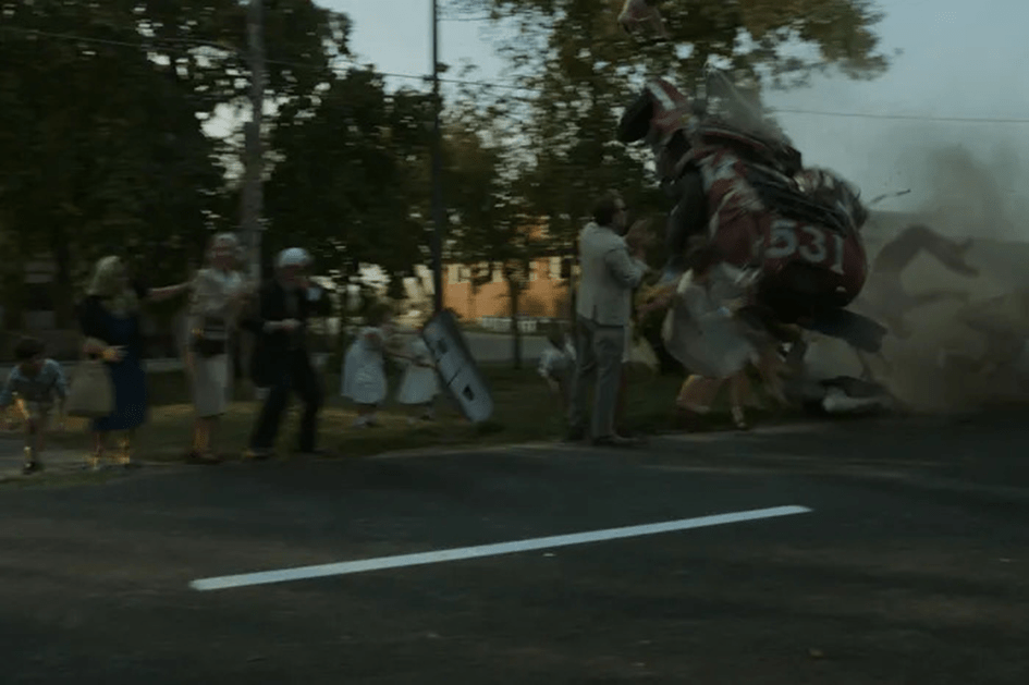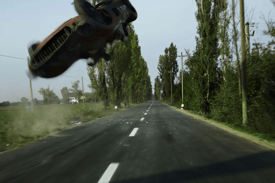 Point de bascule au sens littéral du terme, ce deuxième pavé déchire le pneu avant de la ferrari d’Alfonso de Portago, qui chasse de l’arrière-train, pulvérise la borne d’entrée du village de Guidizzolo et s’envole…. Moment de suspension, raccordé sur les badauds dans les yeux desquels se poursuit la trajectoire ascensionnelle du bolide. Puis retour à la vitesse réelle : la ferrari rebondit sur un pilonne et vient faucher une dizaine de personnes, tonneau après tonneau, avant de finir dans le fossé.