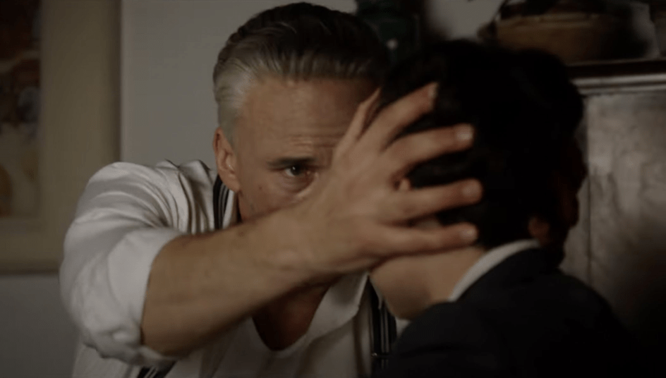 Si l’on observe maintenant le seul personnage d’Enzo, là aussi, quelque chose cloche. Ce que révèle exemplairement sa scène de confession dans le mausolée Ferrari : pris en tenaille par deux caveaux portant le même nom (commun à son frère et à son fils, Alfredo Dino Ferrari), Adam Driver y donne la réplique… à Adam Driver, la mise en scène opérant un champ-contrechamp entre le visage de l’acteur de profil et le visage du même acteur de face, son côté gauche dans la pénombre
