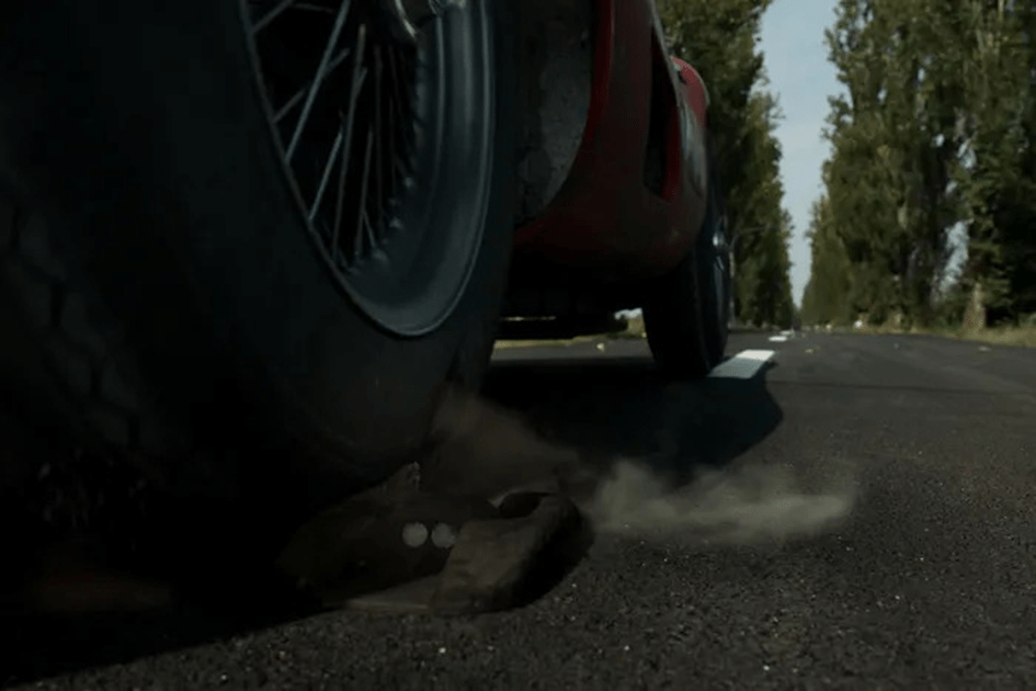Retour à Alfonso de Portago, qui a ces derniers dans sa ligne de mire : il les rattrape, la victoire est à portée d’yeux. Point de vue subjectif sur la route qui défile, puis se distord sous l’effet d’un travelling compensé, le regard du pilote se resserre sur son objectif à l’exclusion de tout le reste. Des cordes de violon s’envolent dans les aigus, accompagnée d’une voix de chanteuse lyrique…. Insert sur un pavé au raz duquel passe la roue avant du pilote, puis sur un deuxième à l’approche duquel la mise en scène, soudain, freine jusqu’au quasi arrêt-sur-image. Et la partition de Daniel Pemberton, comme les rugissements du moteur, s’assourdissent.